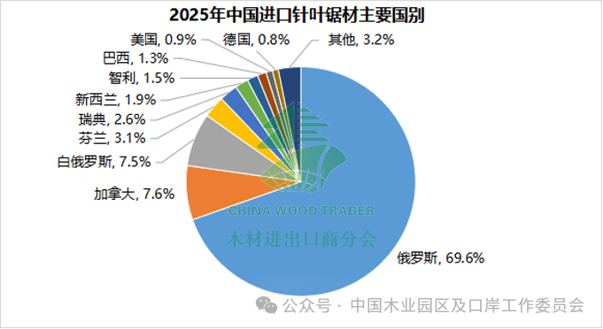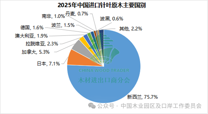 2025年,我国针叶原木的进口国主要有新西兰、日本、加拿大等。从新西兰进口的针叶原木占针叶原木总进口量的75.7%,从美国进口的针叶原木数量同比下降89.3%,德国、波兰均同比下降62%。