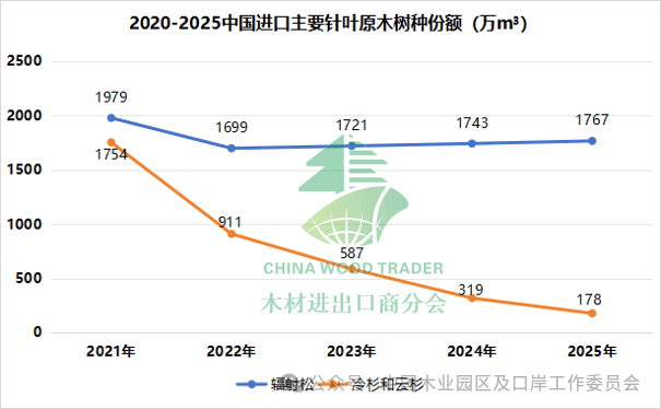 2025年我国针叶原木进口量为2391.8万立方米,同比下降8.4%。主要树种包括辐射松、白松、花旗松、红松和樟子松,其中辐射松原木进口量为1767.1万立方米,同比增加1.4%,占针叶原木总进口量的73.9%。近五年冷杉和云杉的进口量逐年下降,2025年进口量仅为178.5万立方米,同比下降44.1%。