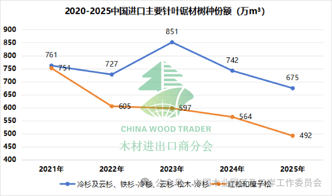 2025年我国针叶锯材进口量为1458.4万立方米,同比下降12.3%。主要树种为冷杉及云杉、铁杉-冷杉、云杉-松木-冷杉以及红松和樟子松。冷杉及云杉、铁杉-冷杉、云杉-松木-冷杉的总进口量同比下降9.1%,红松和樟子松的进口量同比下降12.8%,
