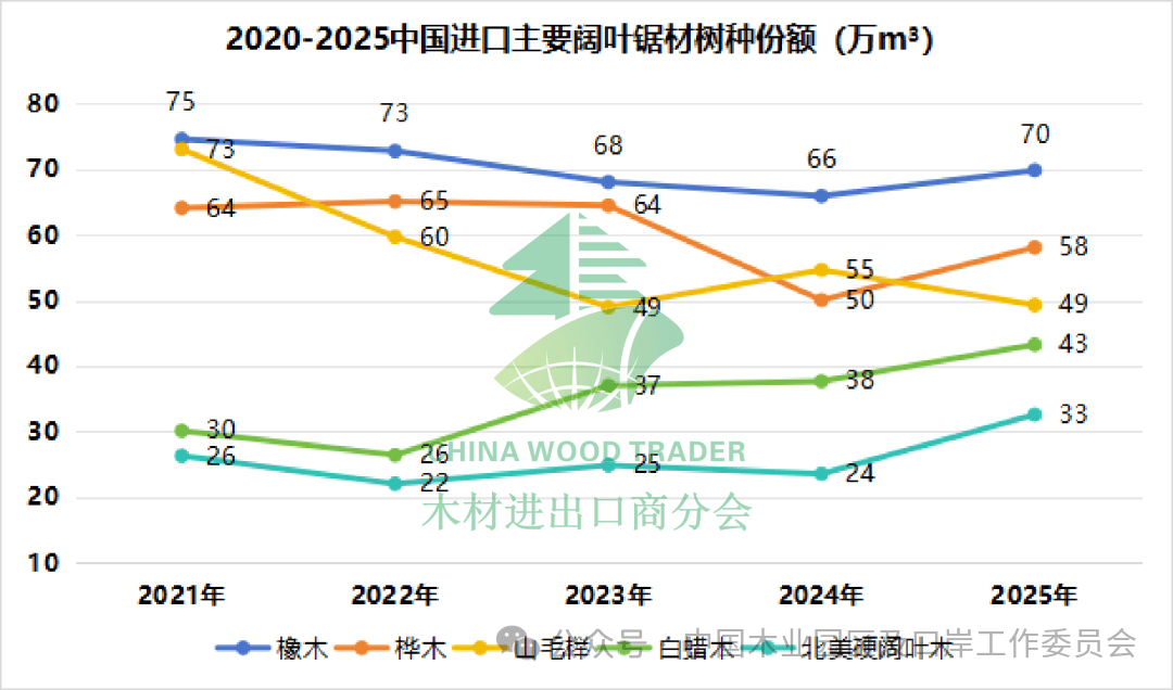 2025年我国阔叶锯材进口量为947.7万立方米,同比下降6.2%。在进口的阔叶锯材中,橡胶木占较大比例,据推测进口量400万立方米左右。其他主要树种有橡木、山毛榉、白蜡木、北美硬阔叶木。其中,橡木锯材主要来自美国、俄罗斯;山毛榉锯材主要来自罗马尼亚、德国、塞尔维亚;白蜡木锯材主要来自越南、俄罗斯、美国。