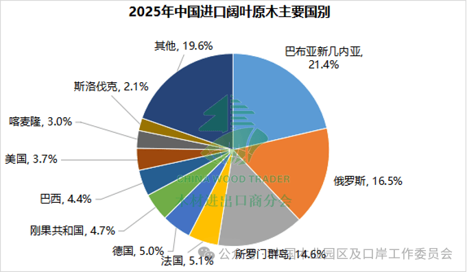 2025年,我国阔叶原木的进口国主要有巴新、俄罗斯、所罗门,分别占阔叶原木总进口量的21.4%、16.5%和14.6%。从美国进口的阔叶原木数量同比下降71.7%。