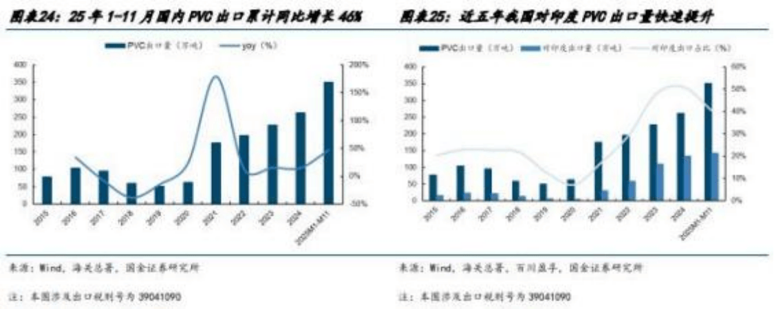 出口方面,2019-2024 年 CAGR 为 39%,2025 年前11 个月国内PVC出口量约为 351 万吨 ,同比增长47%。从出口地区结构来看 ,我国对印度 PVC 出口量与占比持续快速提升 ,根据海关总署与卓创资讯数据 ,2020 年对印度 PVC 出 口 量仅为 4.6 万吨 , 占 总 出 口量的 7%; 2025 年前 11 个月 出 口 量约为 142.1 万吨 , 占总 出 口 量的 41% ,印度国 内 PVC 供应不足问题凸显 ,进口依赖度较高 , 同时伴随 BIS 认证的取消有望带动 PVC出口量继续增长 。